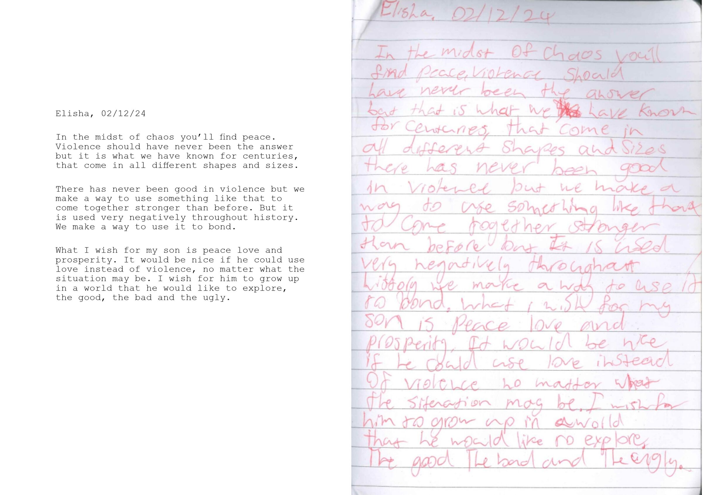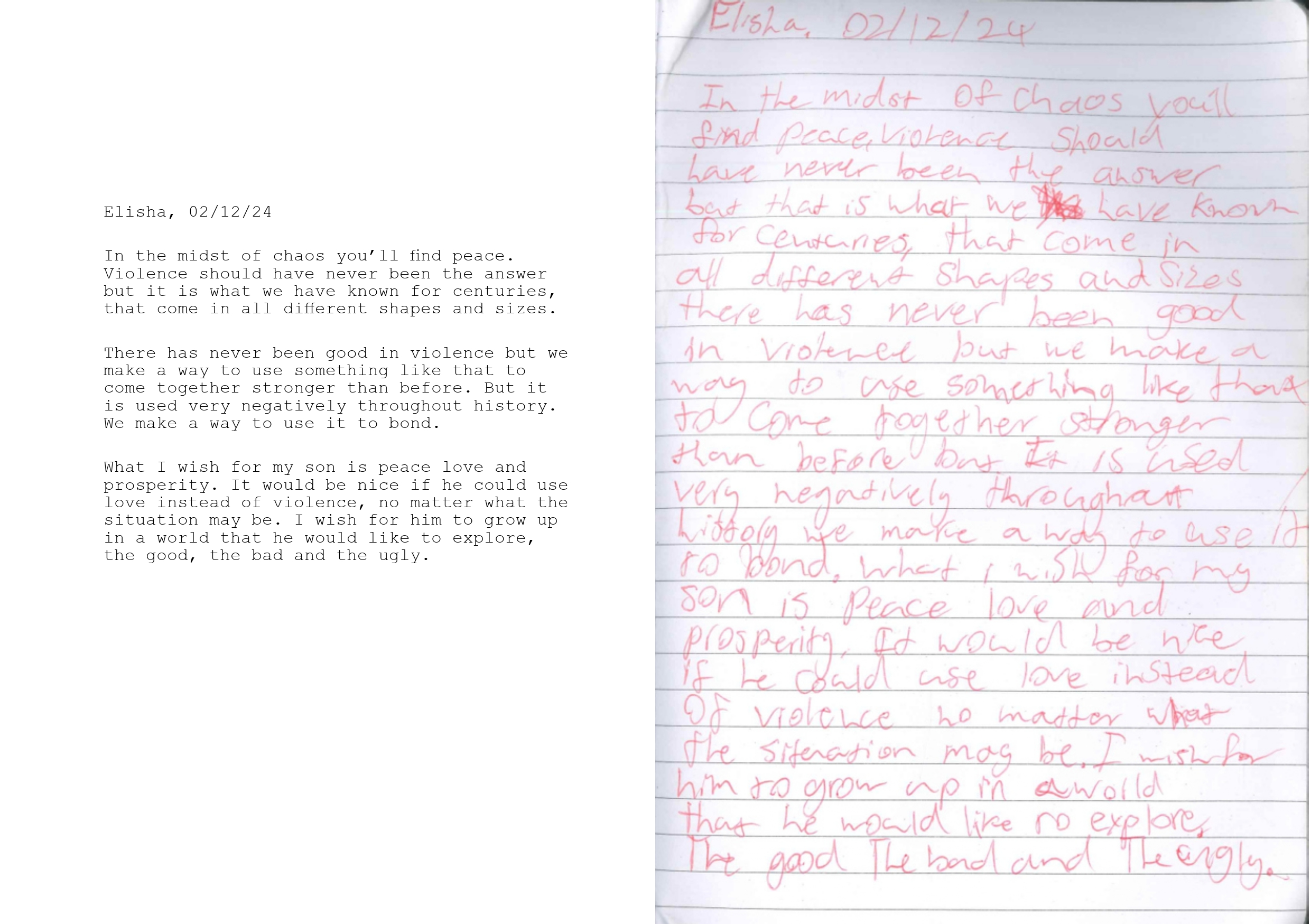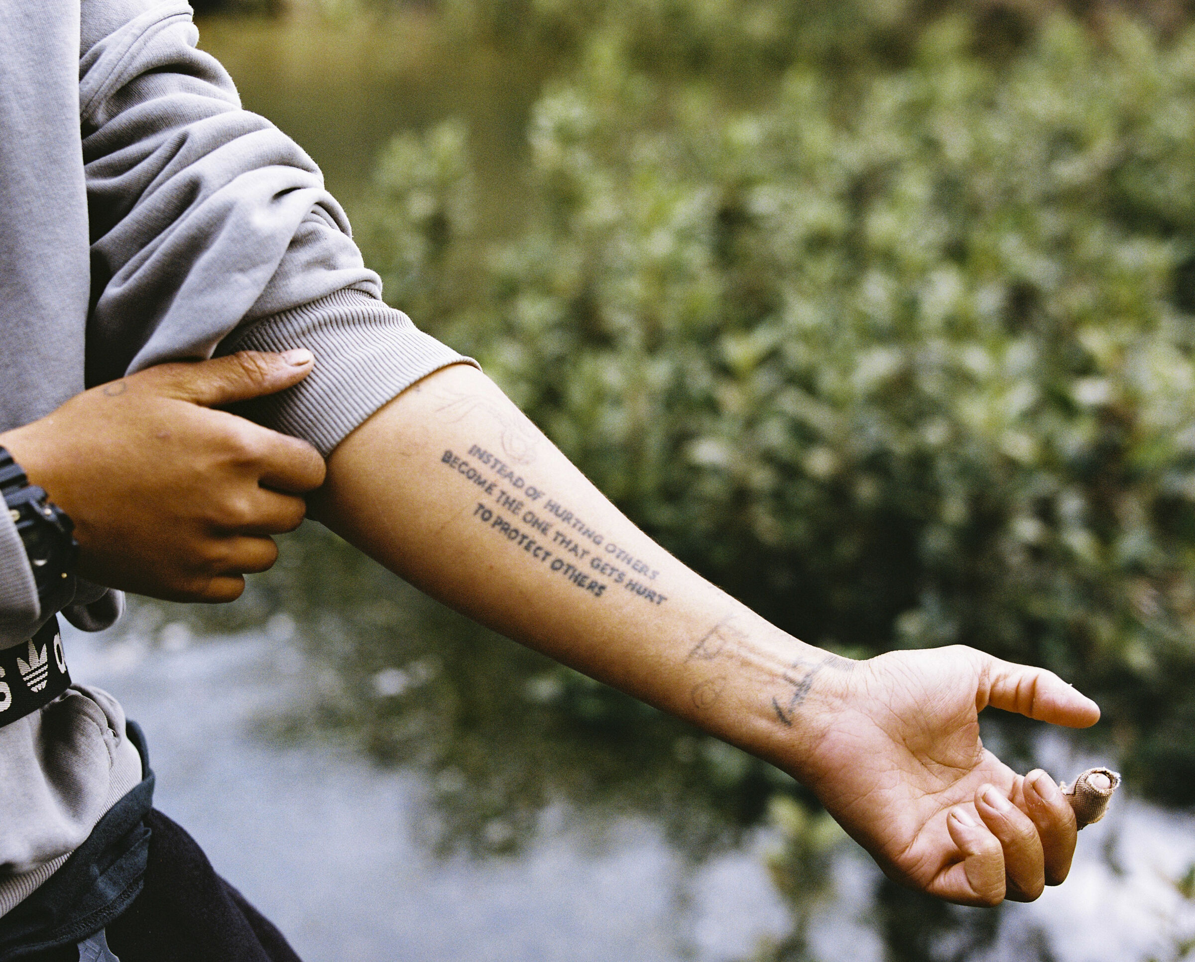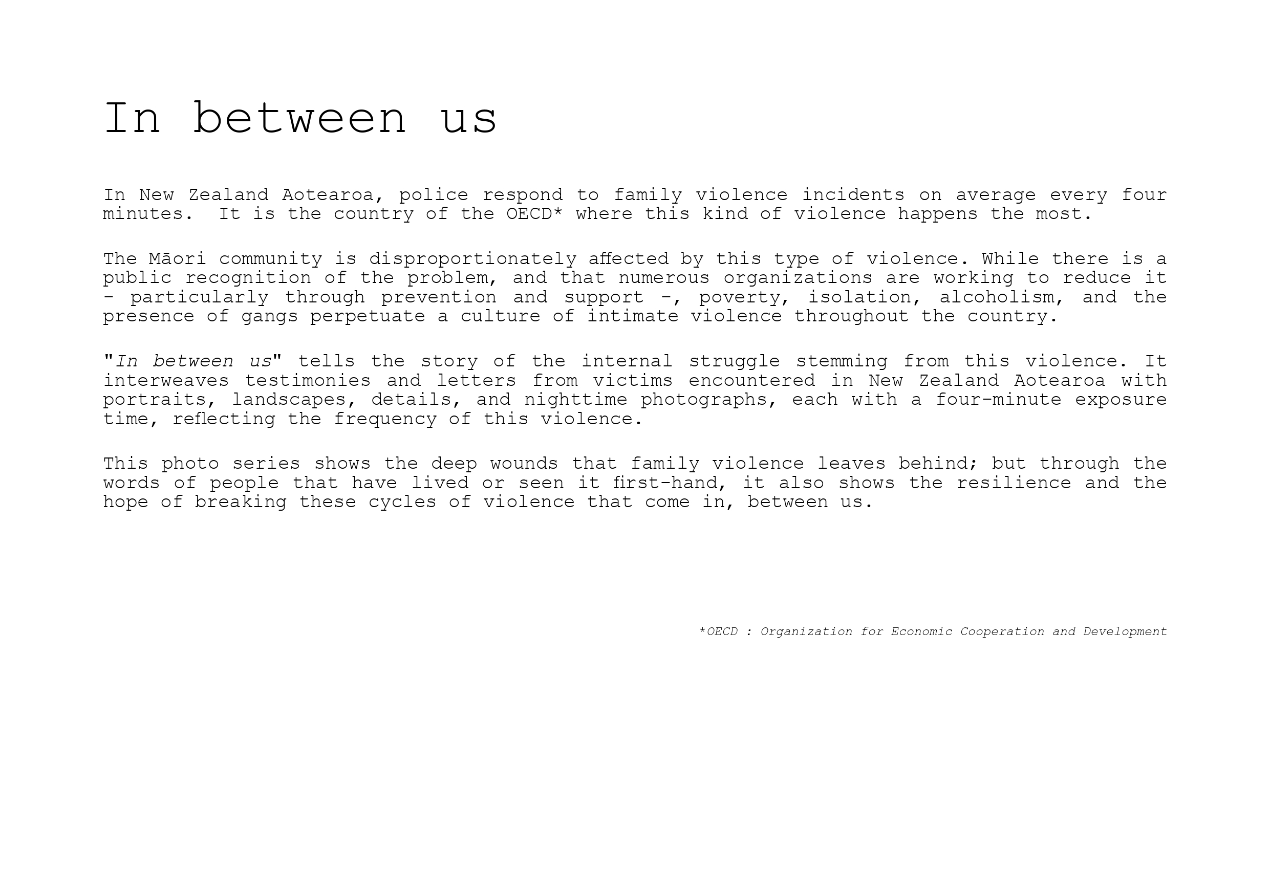 Entre nous raconte la lutte intérieure qui découle de cette violence entrée en nous. Elle tisse ensemble des témoignages et des lettres de victimes, rencontrées en Nouvelle-Zélande, à des portraits, des paysages, des détails et des vues nocturnes dont le temps de pose a été de quatre minutes, en écho à la fréquence de ces violences.